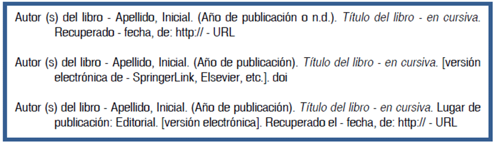 Apellido, A. A. (Año). Título. Ciudad, País: Editorial.
